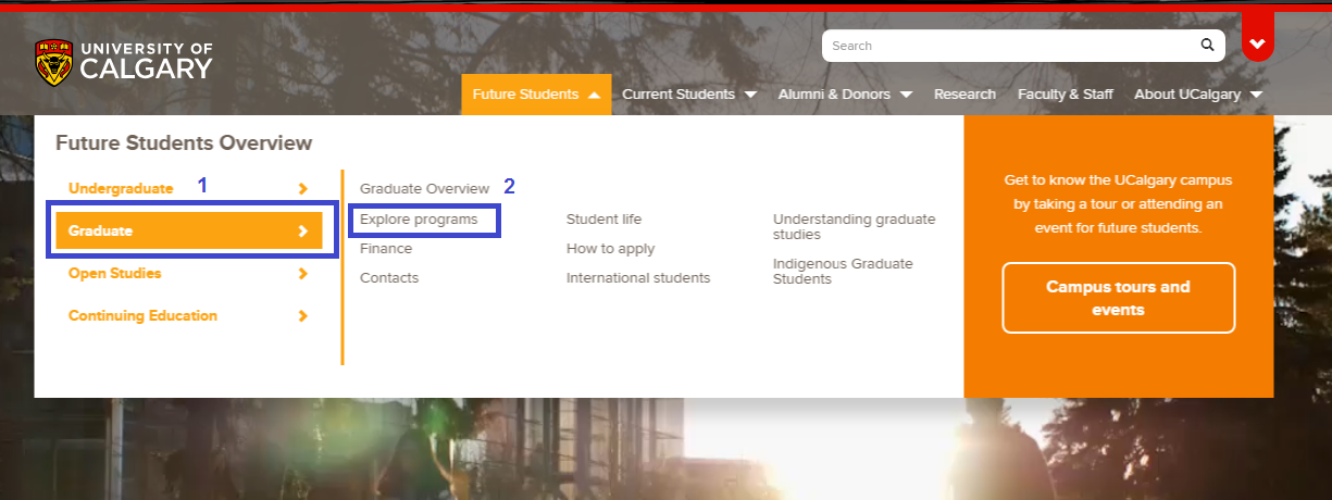 ابتدا وارد سایت دانشگاه کلگری می‌شویم. در صفحه اول و مطابق شکل 1 گزینه Future Student را انتخاب می‌کنیم. در منوی باز شده و مطابق شکل 2 گزینه Graduate و سپس Explore programs را انتخاب می‌کنیم.