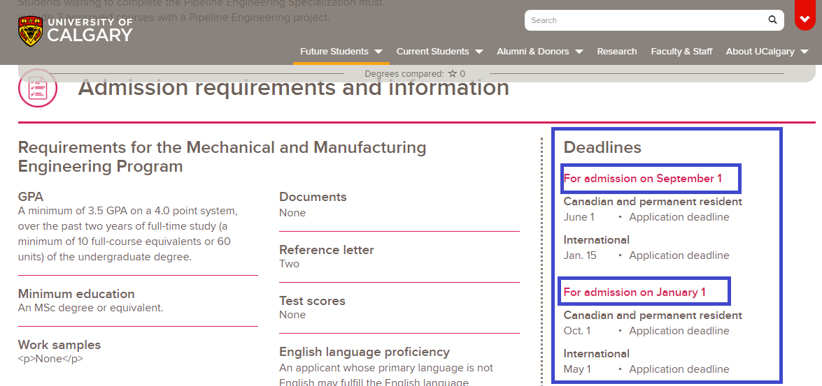 شکل 4- تاریخ ددلاین برای مقطع دکتری در رشته مهندسی مکانیک در دانشگاه کلگری کانادا